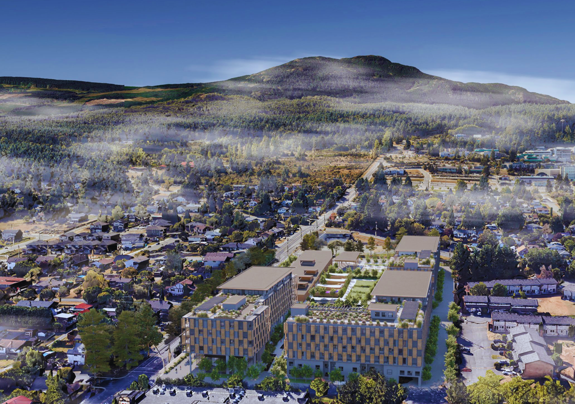 The Te’tuxwtun Project at 564 Fifth Street and 502/505 Howard Avenue in Nanaimo is a 5.8-acre, mixed-use redevelopment plan that strategically combines affordable housing, community services, and cultural facilities. Spearheaded by a partnership between Snuneymuxw First Nation, BC Housing, the City of Nanaimo, and Nanaimo Ladysmith Public Schools, this project targets Nanaimo’s growing housing demand by delivering 358 rental units, spanning both affordable and market categories to ensure diverse resident appeal.